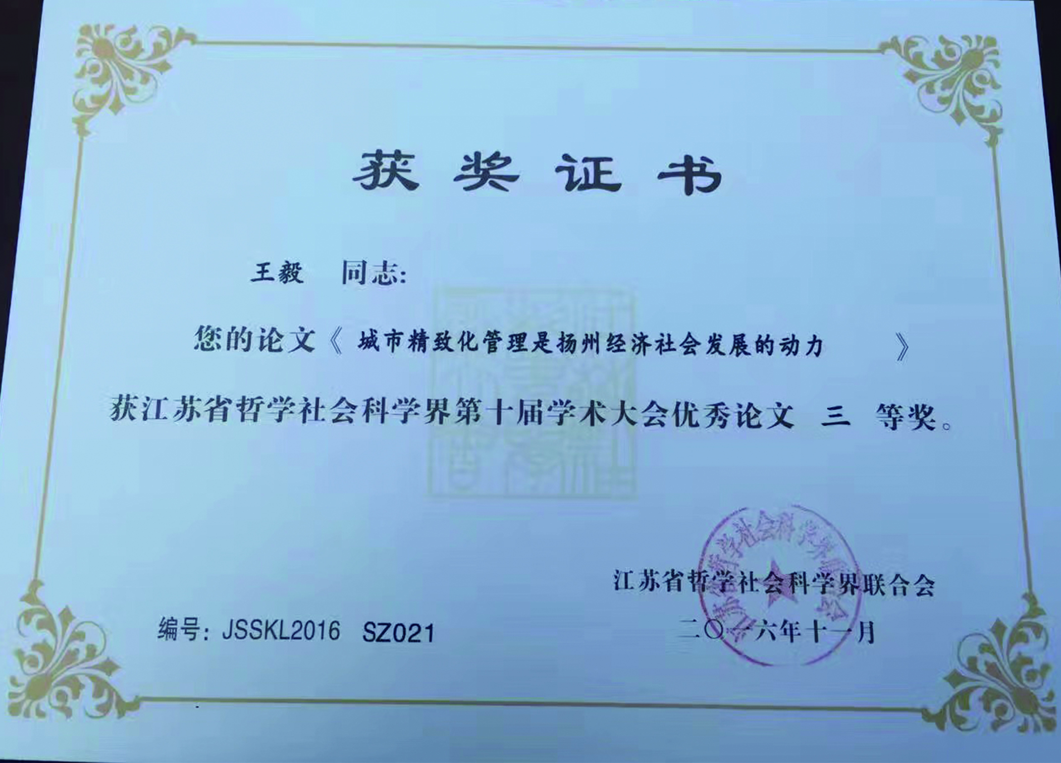 王毅同志的论文《城市精致化管理是扬州经济社会发展的动力》获江苏省哲学社会科学界第十届学术大会优秀论文三等奖