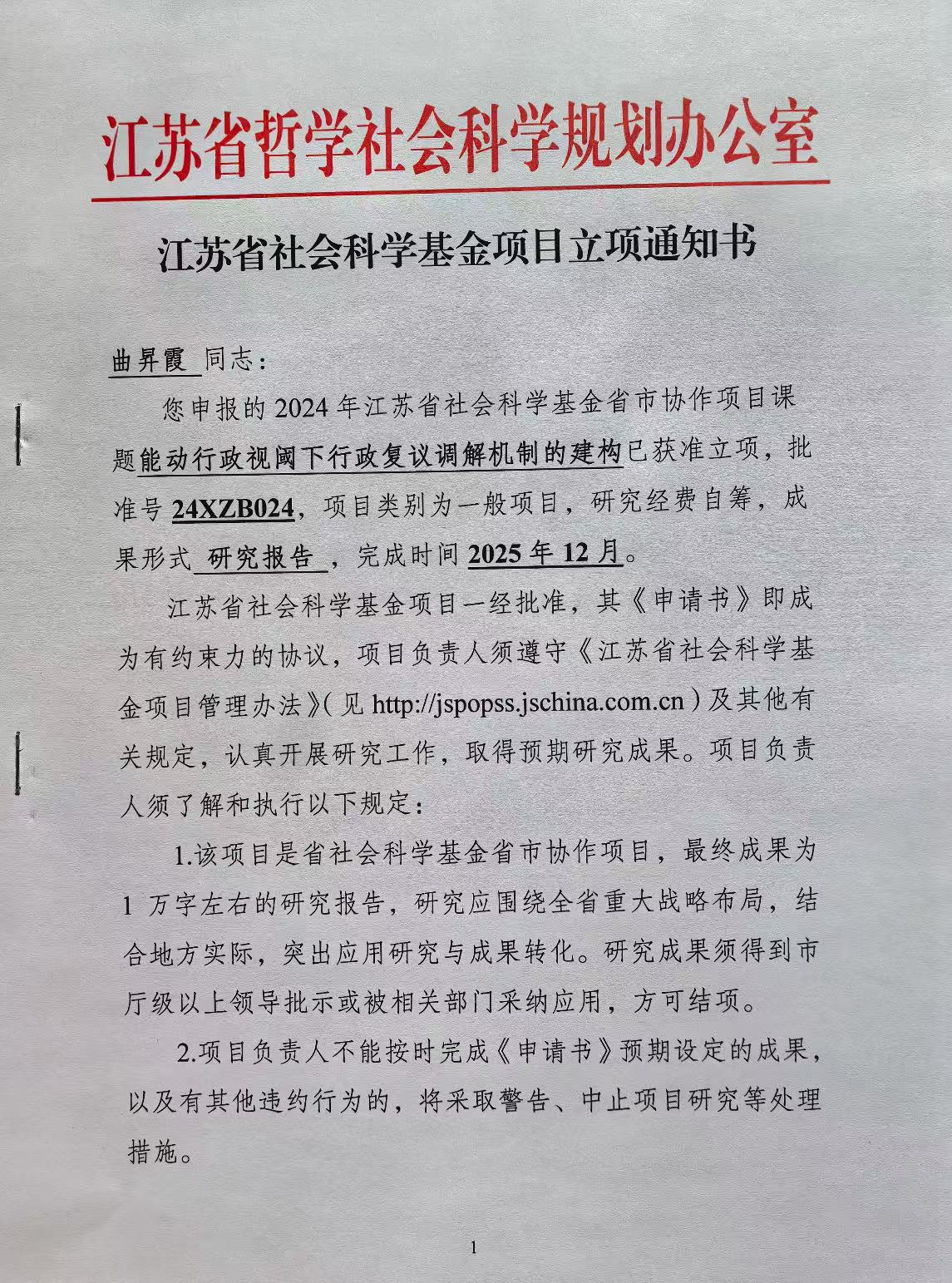 江苏调解学院曲昇霞教授课题《能动行政视阈下行政复议调解机制的建构》获江苏省社科基金立项