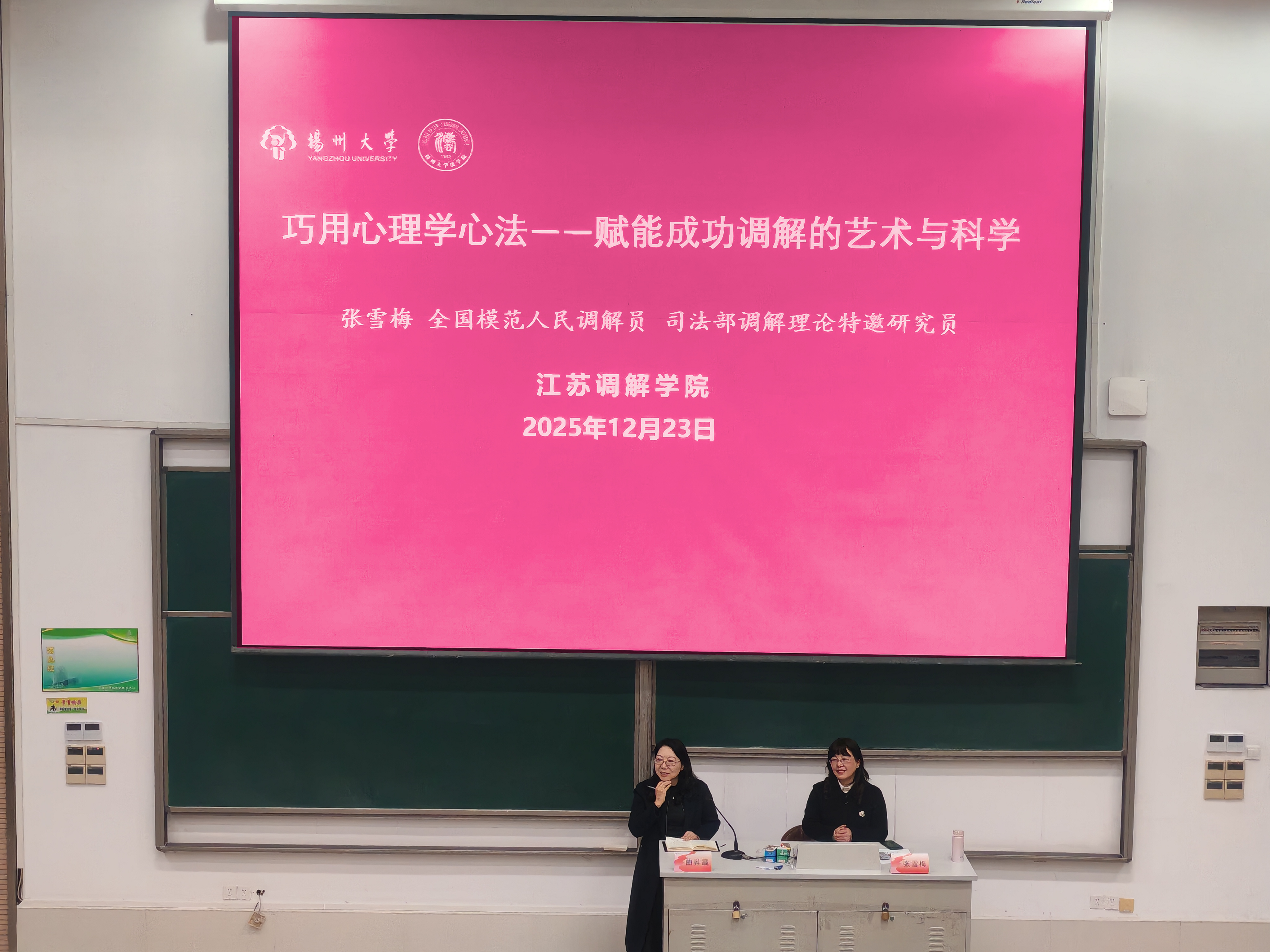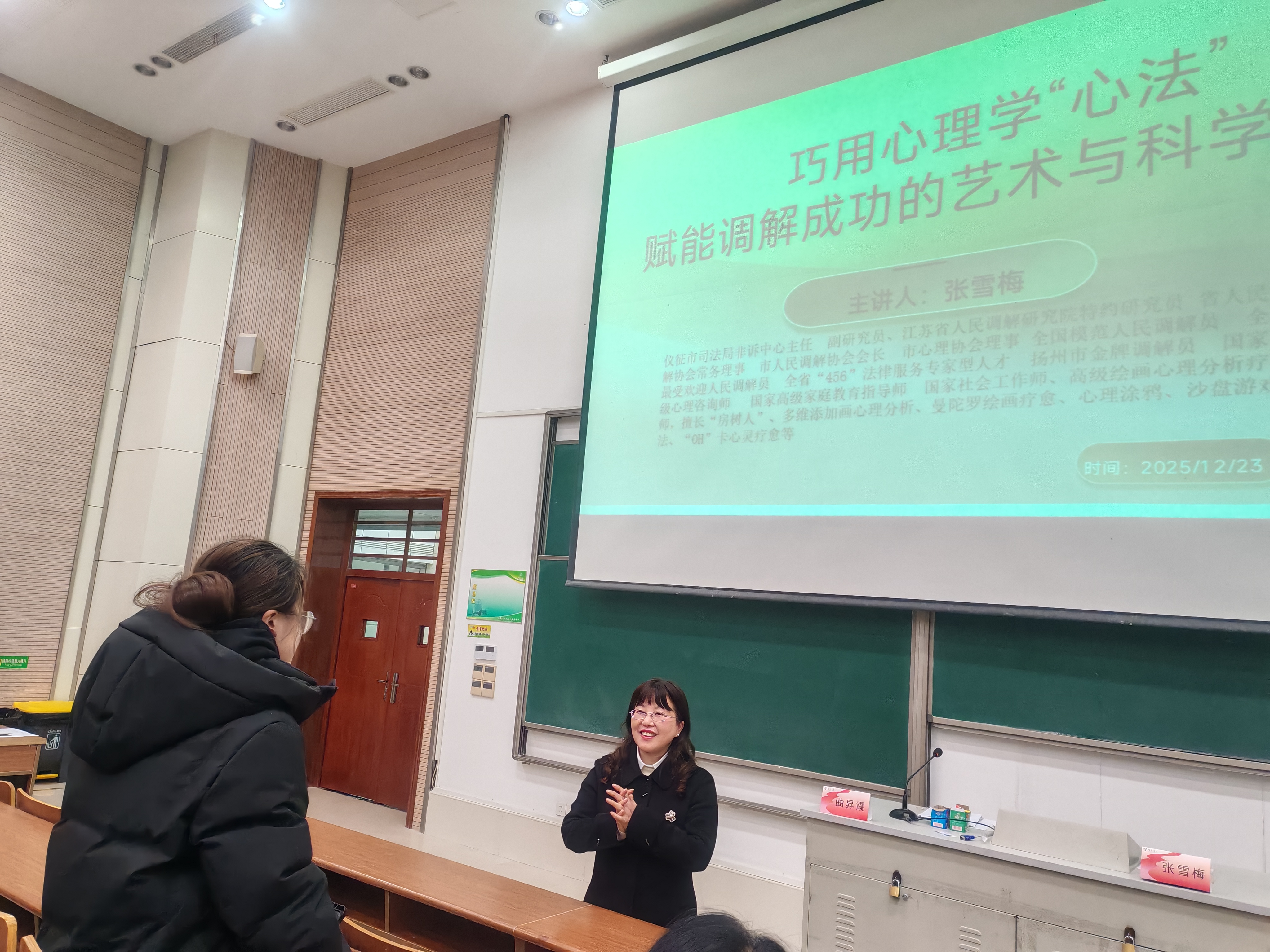 12月23日下午,江苏调解学院“调解理论与实务”系列讲座在文津楼E206教室成功举办。全国模范人民调解员、司法部调解理论特邀研究员张雪梅应邀作题为“巧用心理学心法——赋能成功调解的艺术与科学”的专题报告。讲座由法学院院长曲昇霞教授主持,学院师生160余人参加了本次活动。
